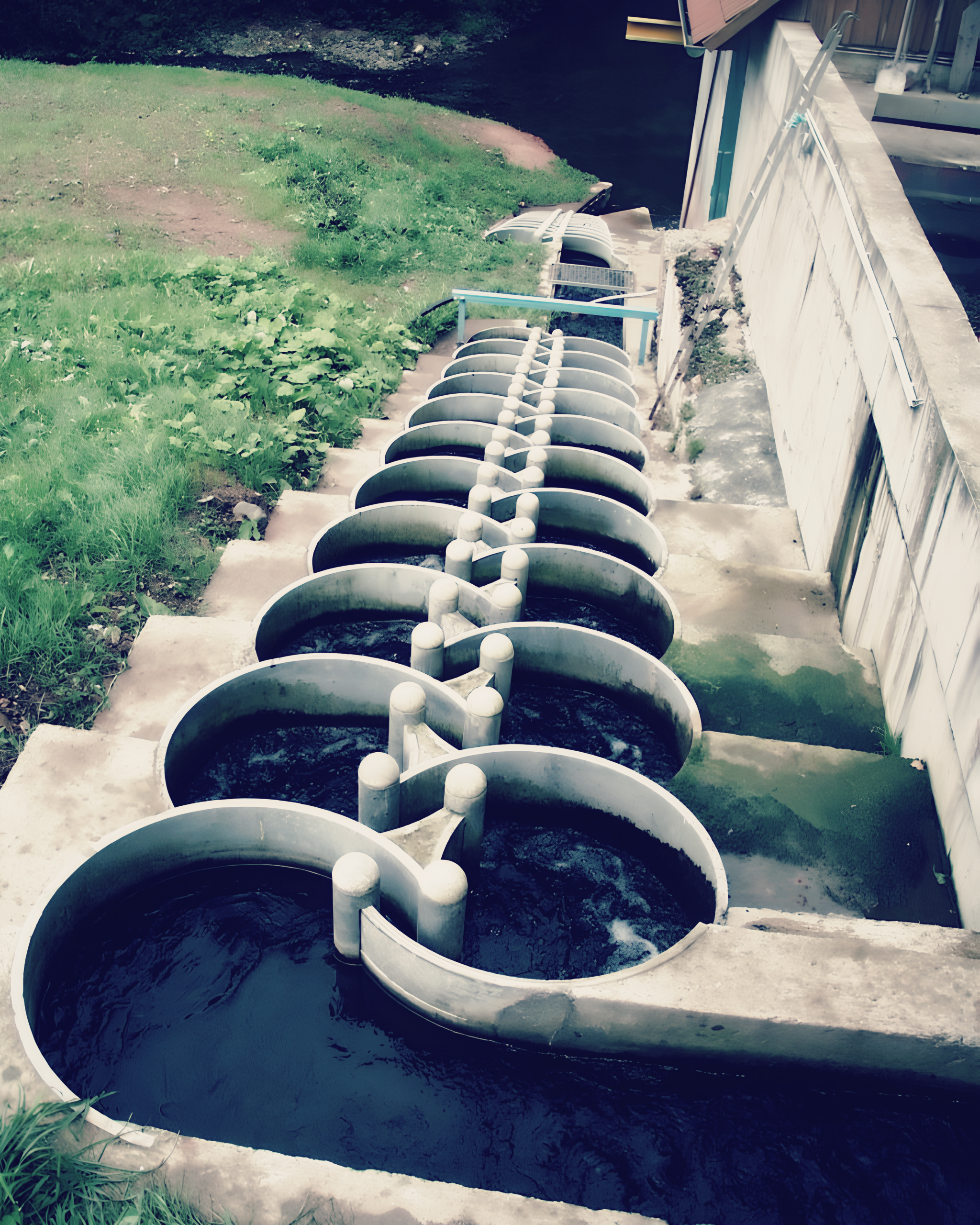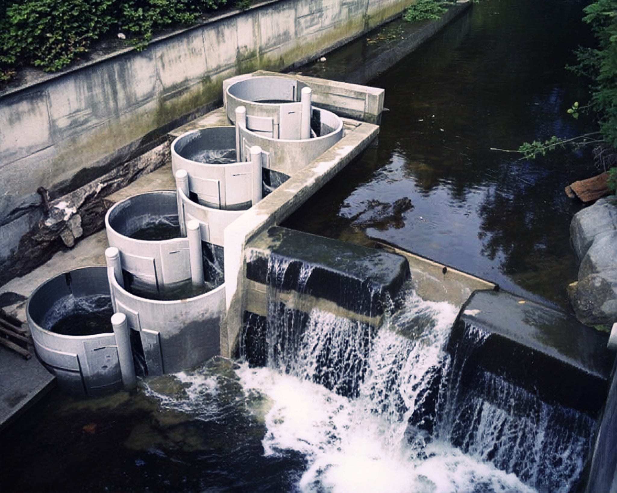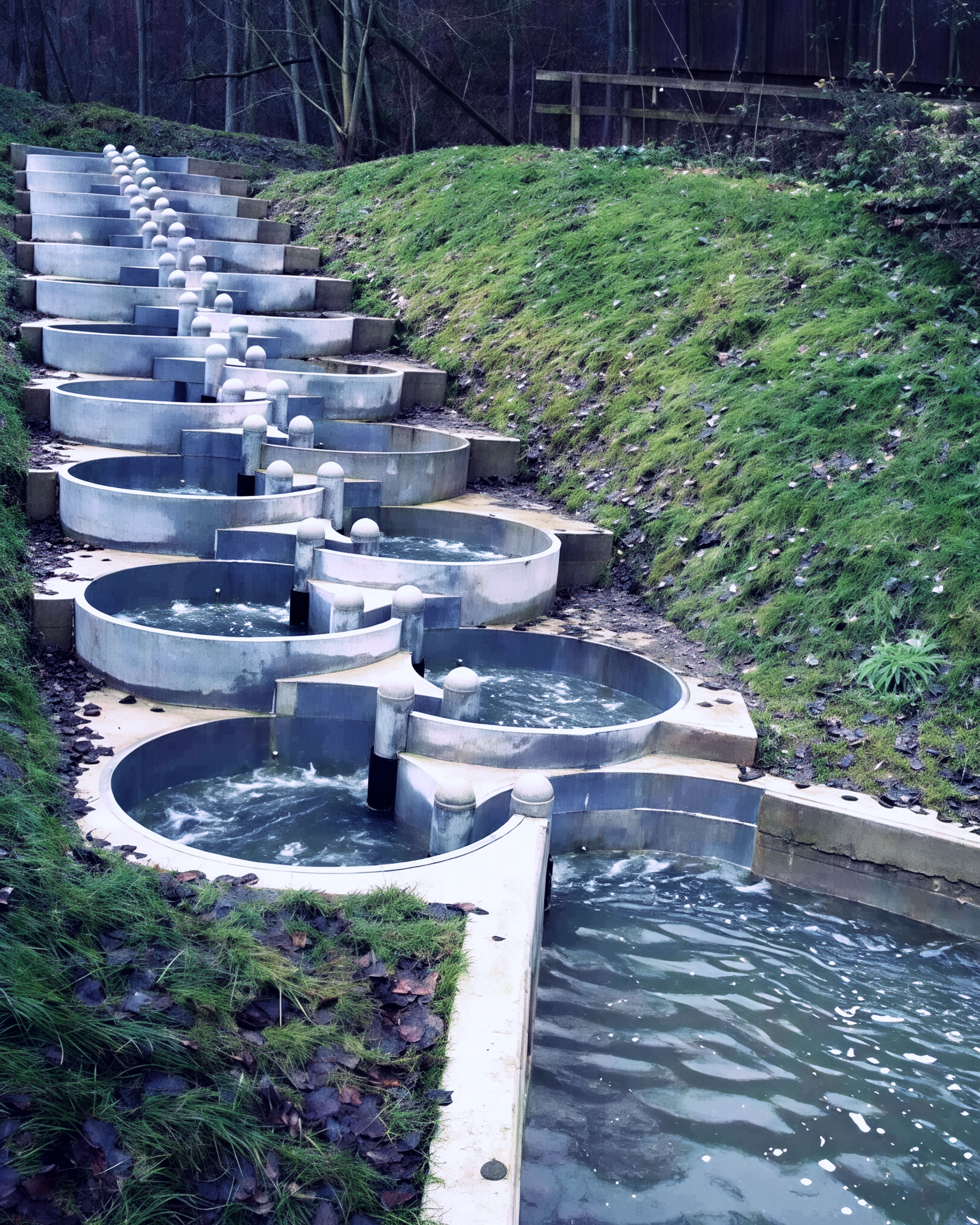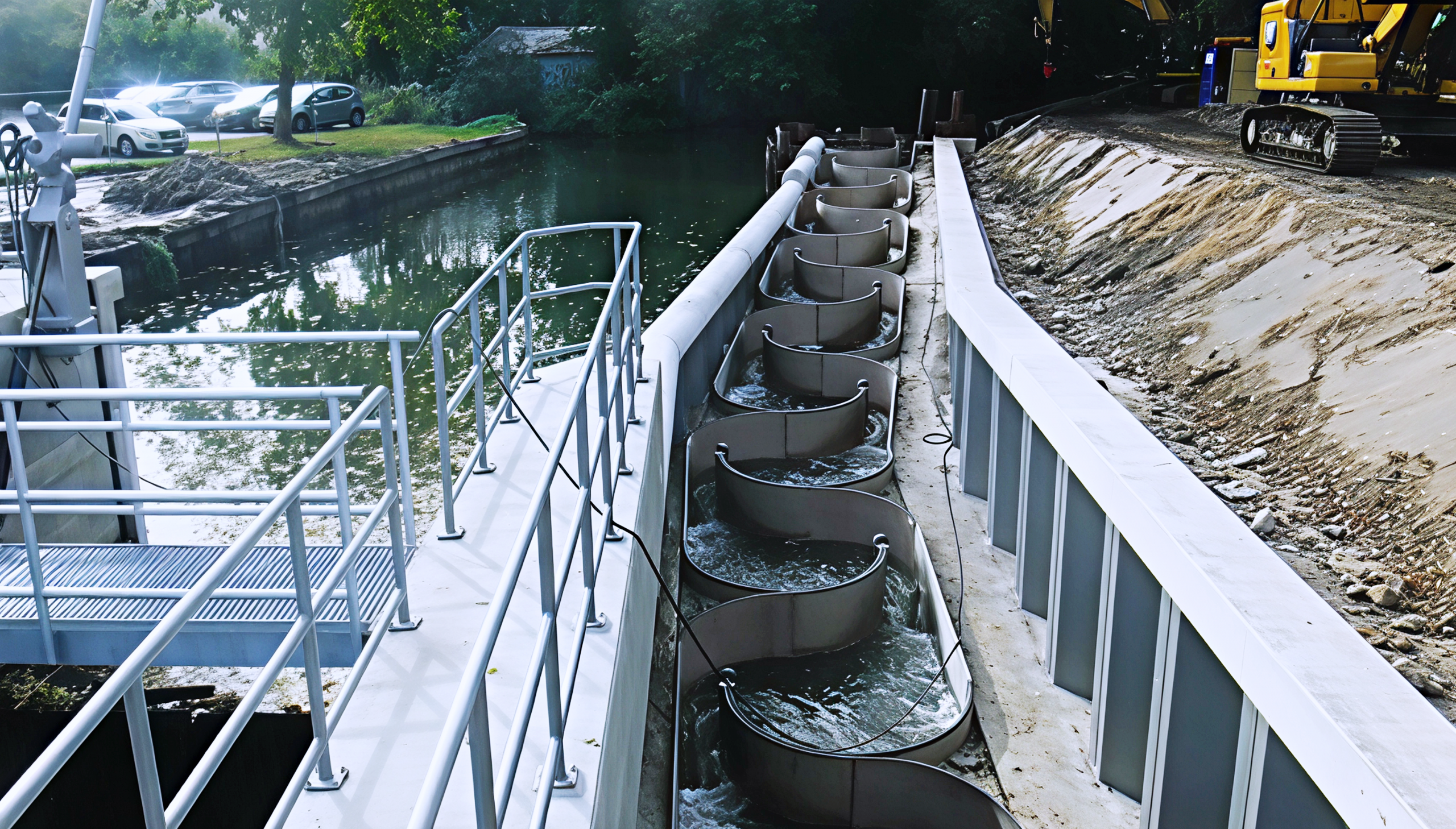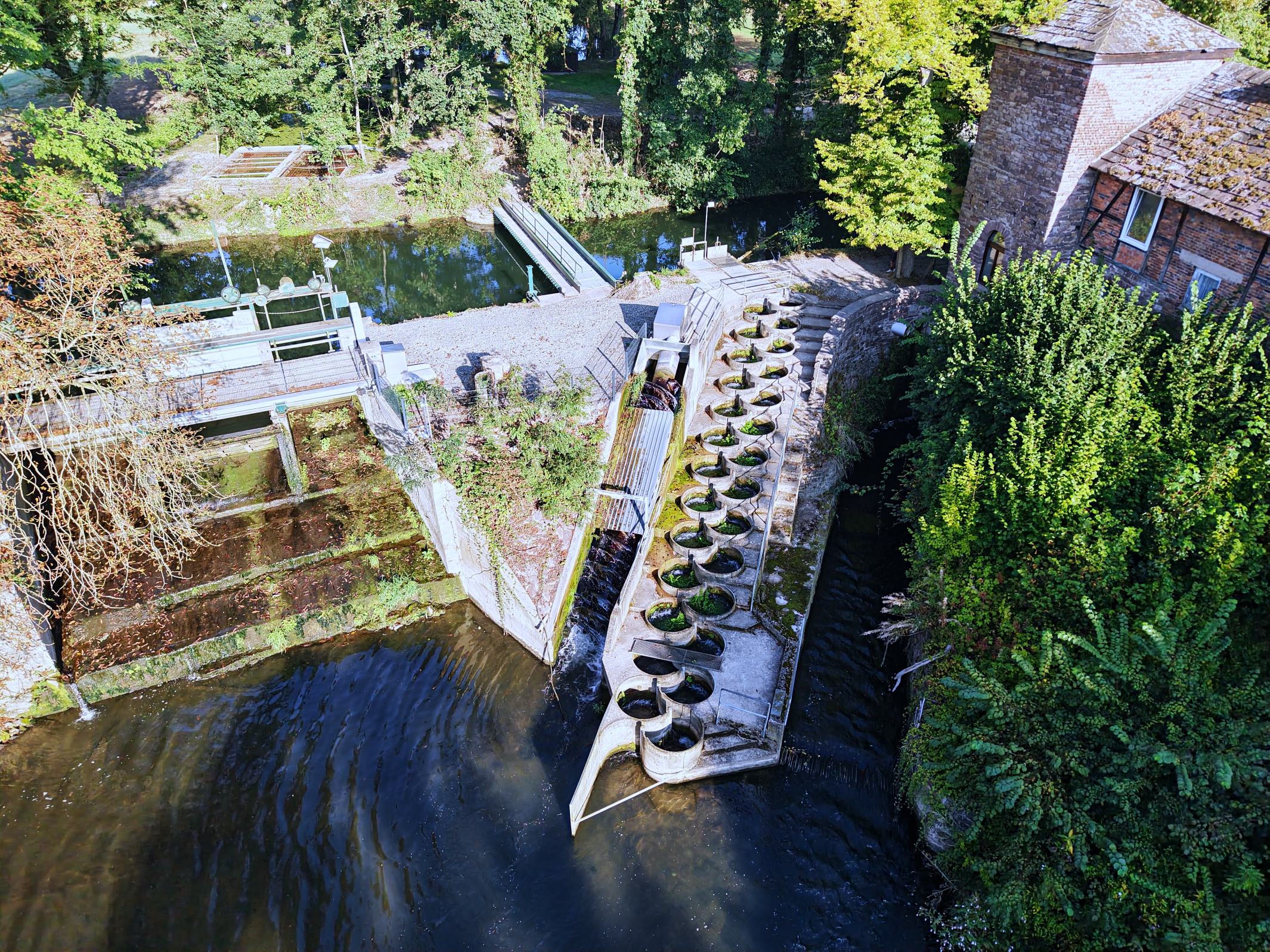 Detailaufnahmen verdeutlichen die strömungslenkenden Elemente: gerundete Becken, regulierbare Schlitzöffnungen und den strukturierten Sohlaufbau.